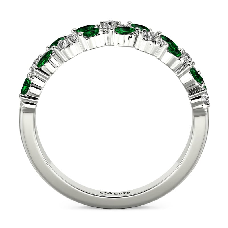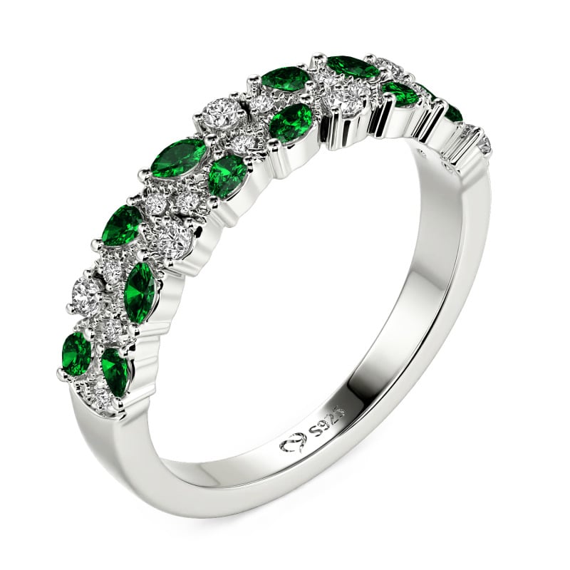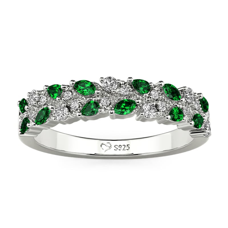 Grappoli con venature fogliari si curvano in un abbraccio a strati, ogni fronda cosparsa di pietre che catturano la luce come rugiada mattutina su fogliame vivo. Dalla finitura del metallo alla tonalità delle gemme, ogni elemento si inchina alla tua visione—Questa fede nuziale eternità a doppia fila con grappolo di rami e foglie Jeulia ti permette di indossare la poesia della natura in colori che solo tu sceglieresti, unica come la stagione che ti sembra più familiare.
