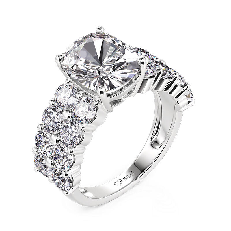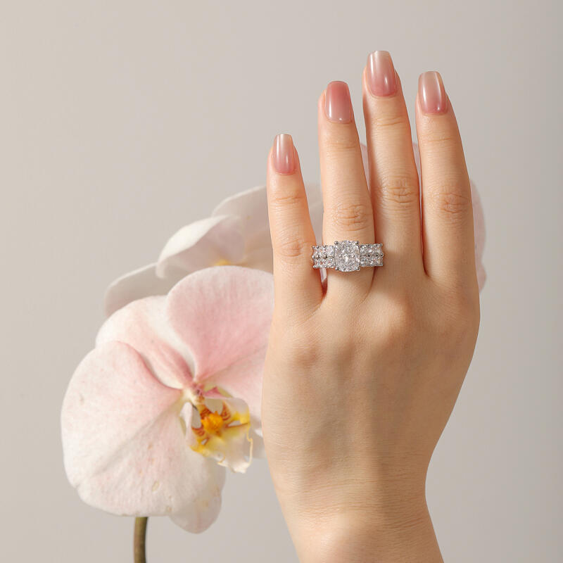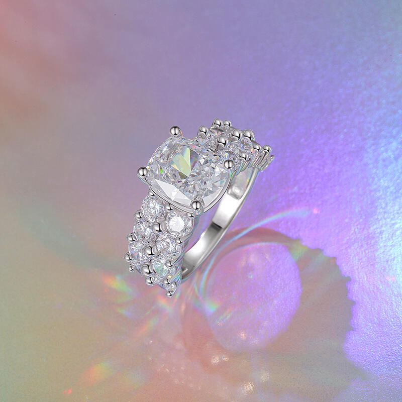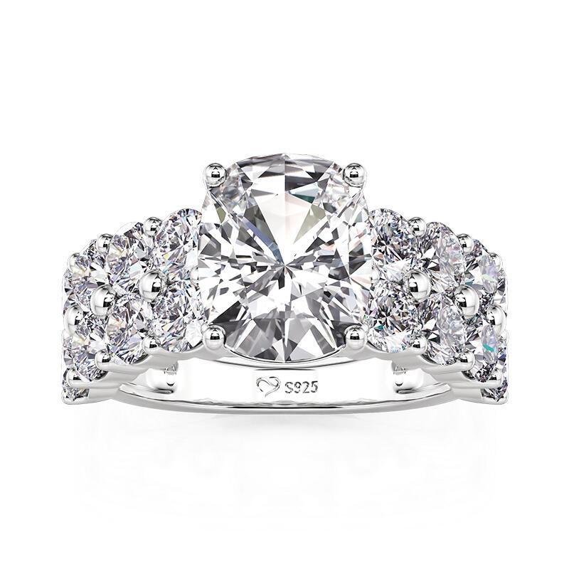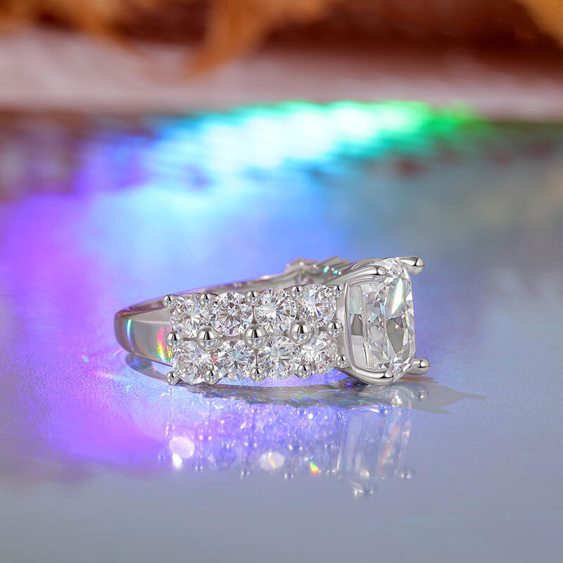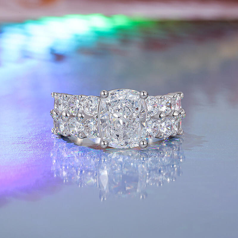 Questo splendido anello di fidanzamento radiant è progettato con una doppia fascia eternità a pavé come nucleo, e il delicato processo di incastonatura fa brillare ogni piccola pietra con una luce brillante, esaltando lo splendore accattivante della pietra principale radiant tagliata a ghiaccio. La pietra principale è pura e trasparente come il ghiaccio e la neve, e le superfici tagliate riflettono luci e ombre affascinanti, rivelando eleganza e nobiltà nel suo splendore. Il design dell'anello di fidanzamento a doppia fascia eternità pavé non solo aggiunge un senso di gerarchia, ma rende anche la forma complessiva piena e tesa.