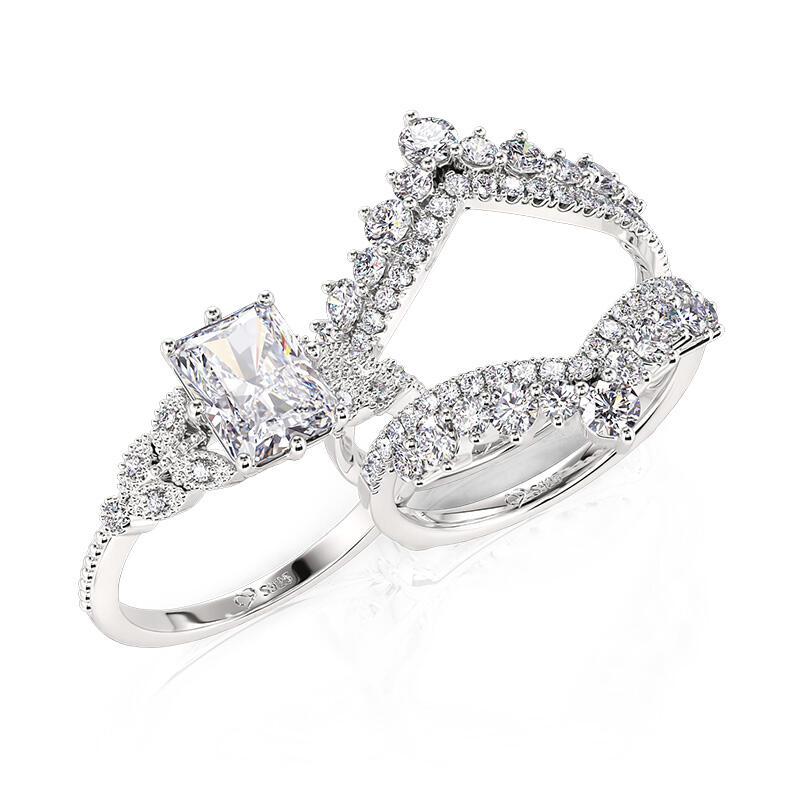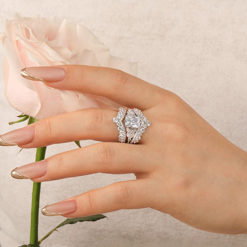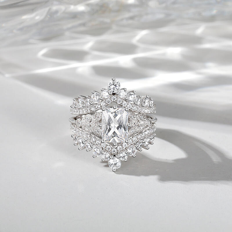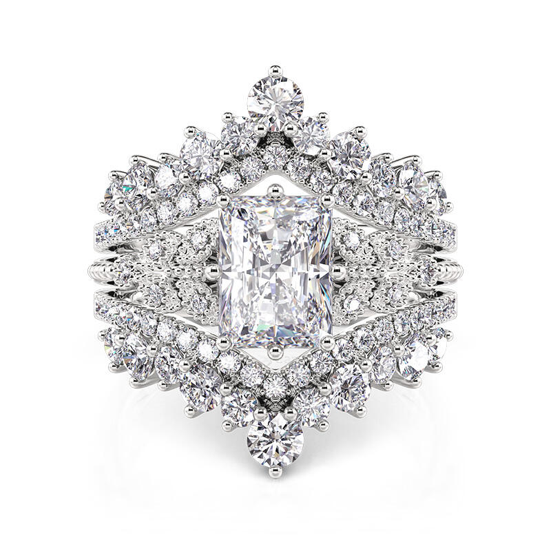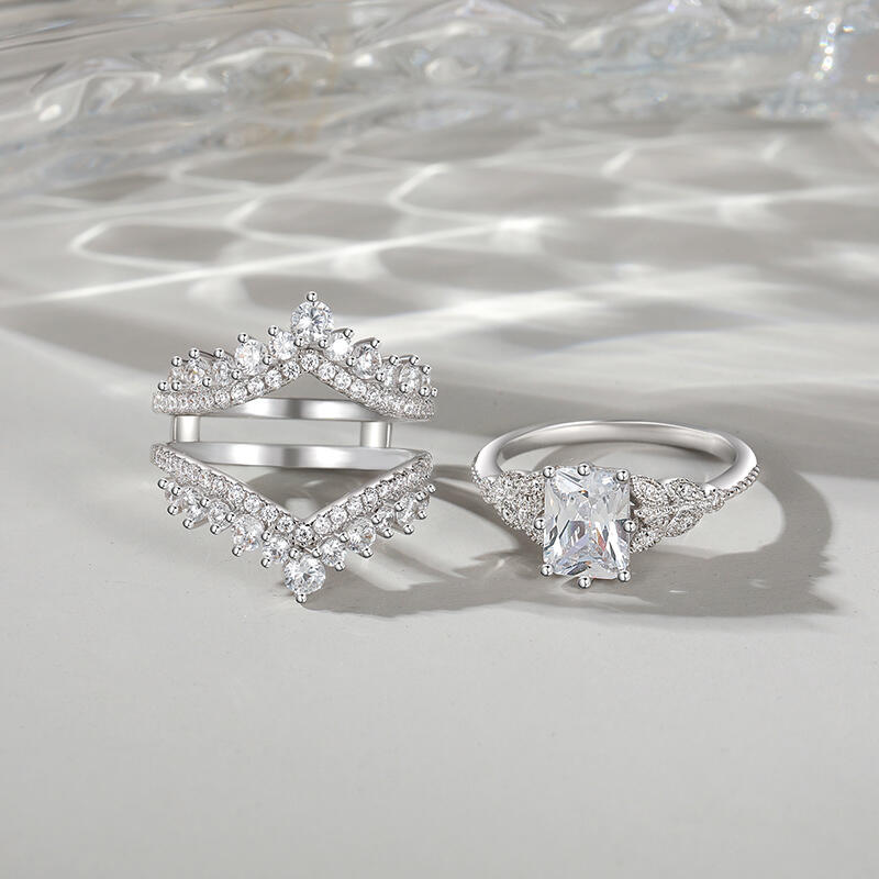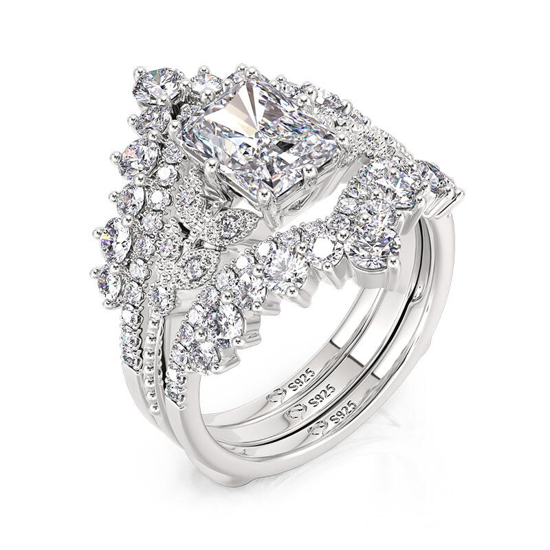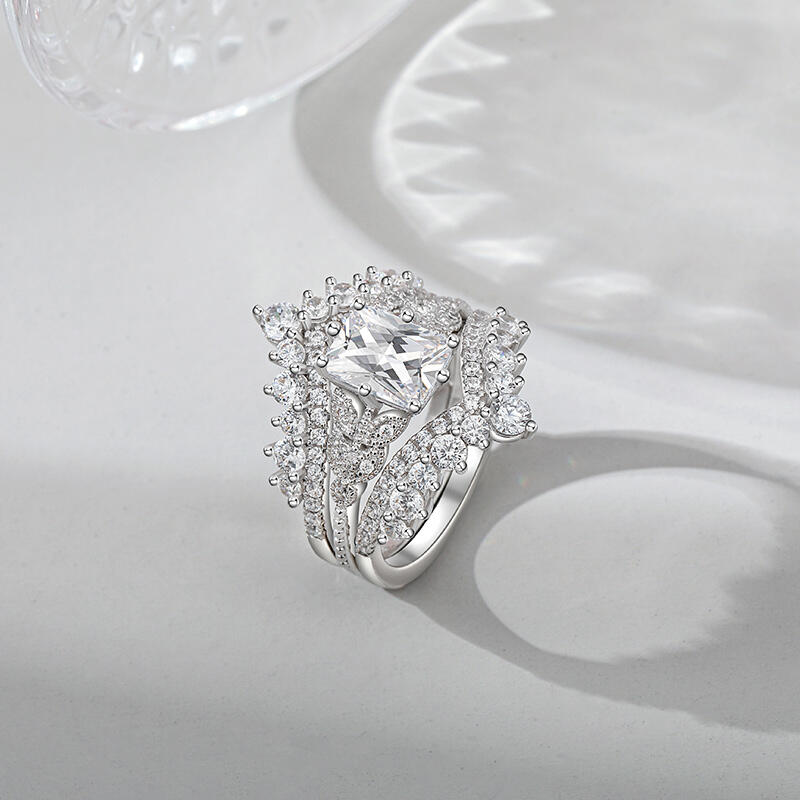 Scopri il fascino magico del nostro set di anelli intercambiabili a forma di farfalla per l'eternità. Al centro dell'anello principale si trova una pietra preziosa dal taglio radiante, squisitamente incorniciata da intricati elementi a forma di farfalla che danzano con grazia su entrambi i lati, simboleggiando la bellezza della trasformazione e dell'amore infinito. A completare questo incantevole pezzo c'è una splendida fascia a due livelli, caratterizzata da un design delicato che aggiunge un tocco di raffinatezza al tuo look. Perfetto per l'anima romantica che ama la versatilità, questo set di anelli a forma di farfalla per l'eternità ti consente di mescolare e abbinare per creare combinazioni uniche.